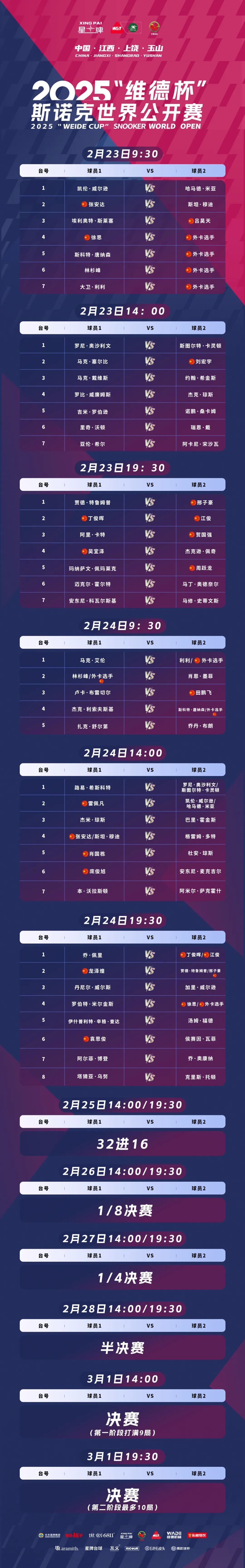 2月23日首个比赛日9:30,去年世锦赛冠军凯伦·威尔逊打响揭幕战,张安达同一时段迎战小将穆迪。14:00,塞尔比、希金斯两位世锦赛“四冠王”在这个时段登场。19:30,世界第一、卫冕冠军特鲁姆普对阵从玉山国际台球学院走出来的职业小将邢子豪,“中国一哥”丁俊晖和江俊上演德比战。