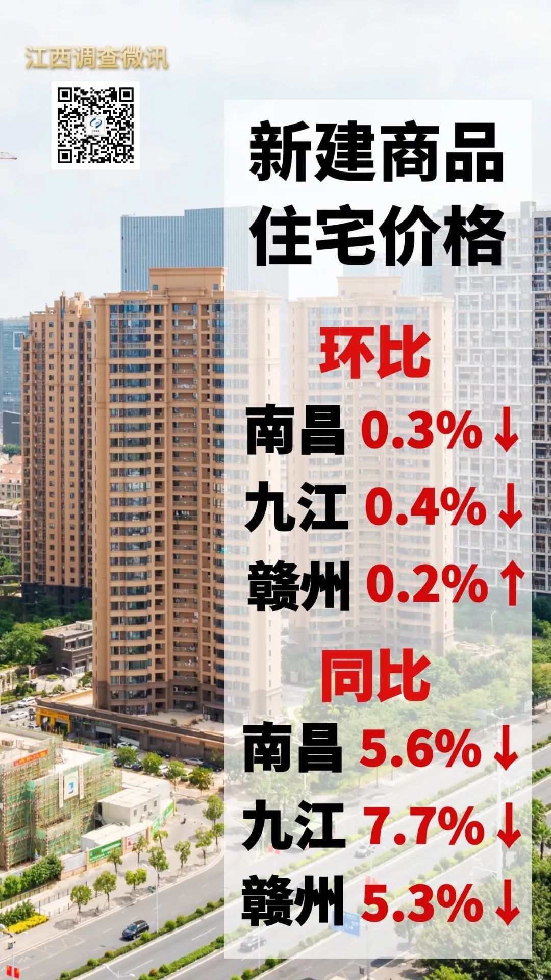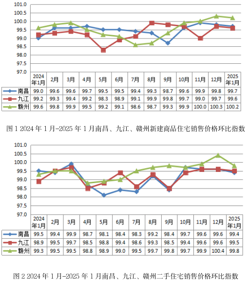 从环比看,三个重点监测城市价格指数有所回落。1月份,新建商品住宅销售价格方面,南昌、九江环比分别下降0.3%、0.4%,降幅均较上月扩大0.1个百分点;赣州环比上涨0.2%,涨幅较上月回落0.1个百分点。二手住宅价格方面,南昌、九江和赣州环比分别下降0.6%、0.5%和0.2%,其中南昌、九江降幅分别较上月扩大0.2个、0.1个百分点,赣州较上月回落0.6个百分点。