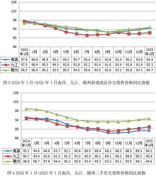 从同比看,三个重点监测城市商品住宅价格同比降幅收窄为主。1月份,新建商品住宅销售价格方面,南昌、九江和赣州同比分别下降5.6%、7.7%和5.3%,降幅分别收窄0.8个、0.4个和0.6个百分点。二手住宅价格方面,南昌、九江和赣州同比分别下降10.8%、9.1%和5.4%,其中九江、赣州降幅较上月分别收窄0.6个、0.5个百分点,南昌降幅扩大0.1个百分点。
