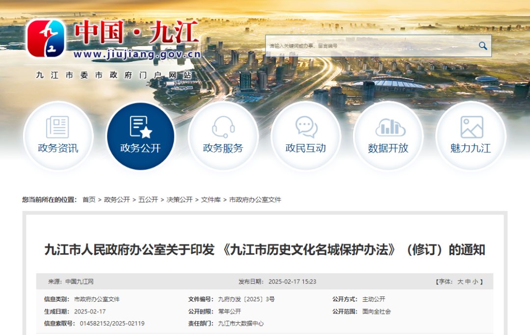 为加强历史文化名城的保护与管理,根据《中华人民共和国城乡规划法》《中华人民共和国文物保护法》《中华人民共和国消防法》《历史文化名城名镇名村保护条例》《九江市历史建筑保护条例》等法律法规的规定,结合本市实际,制定《九江市历史文化名城保护办法》。
