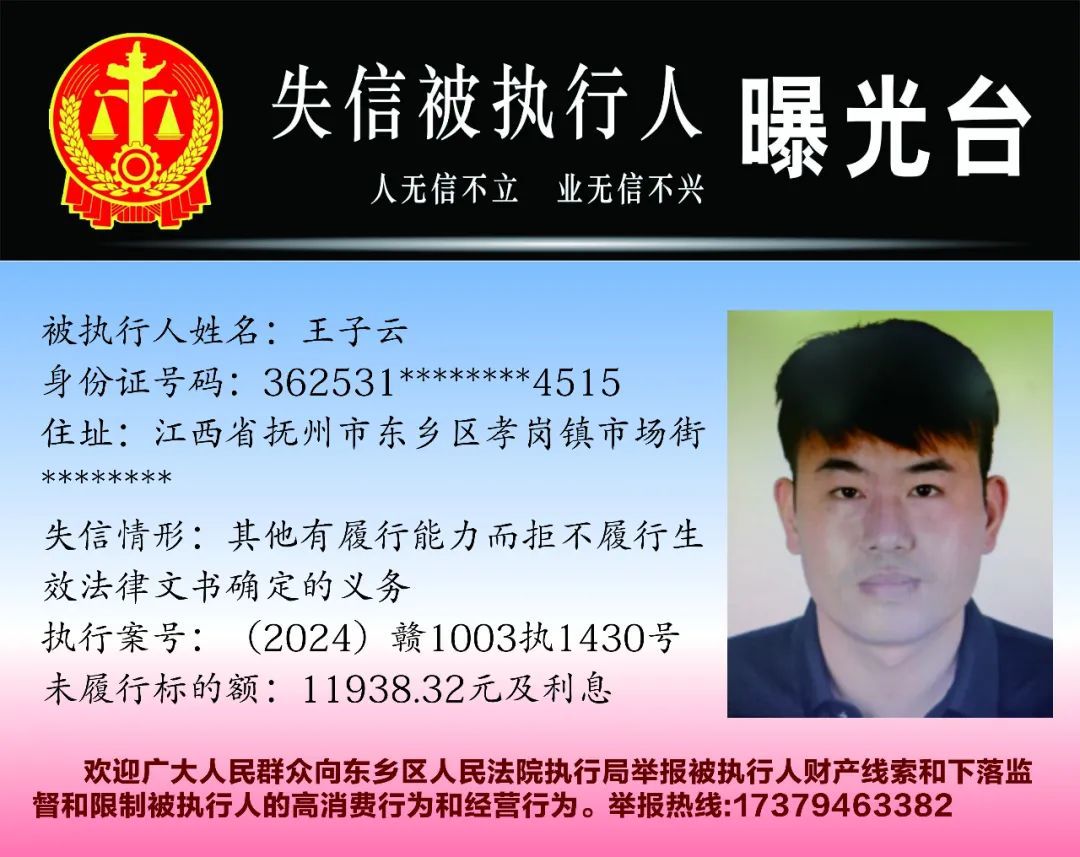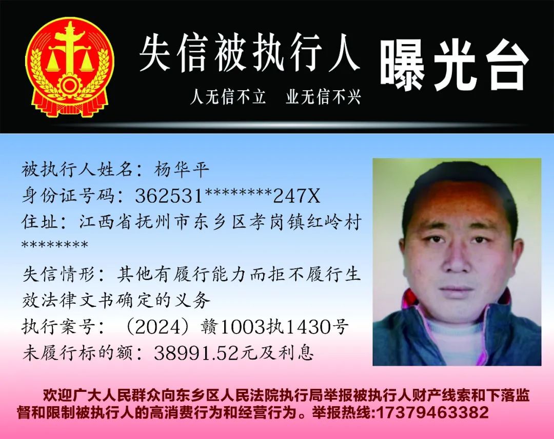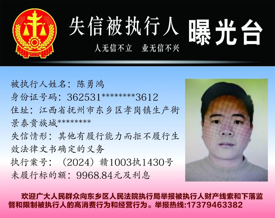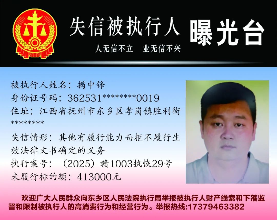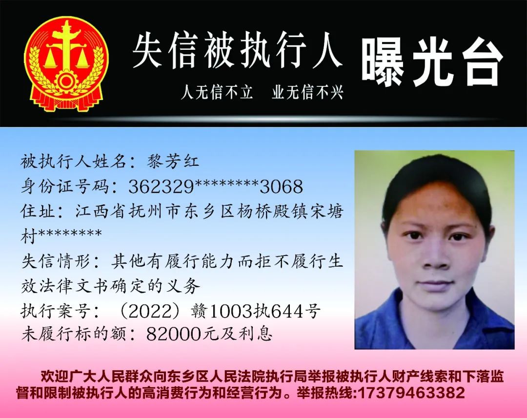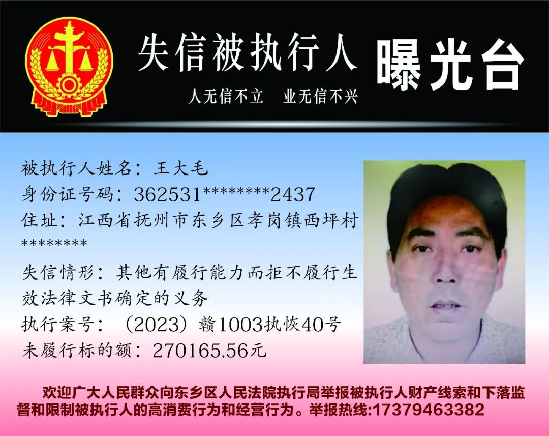 为促使被执行人自觉履行生效法律文书确定的义务,推进社会诚信建设,贯彻落实我省“执行长效机制巩固年”专项活动,抚州市东乡区人民法院根据《中华人民共和国民事诉讼法》《最高人民法院关于公布失信被执行人名单信息的若干规定》等相关法律和规定,决定对下列失信被执行人予以曝光。