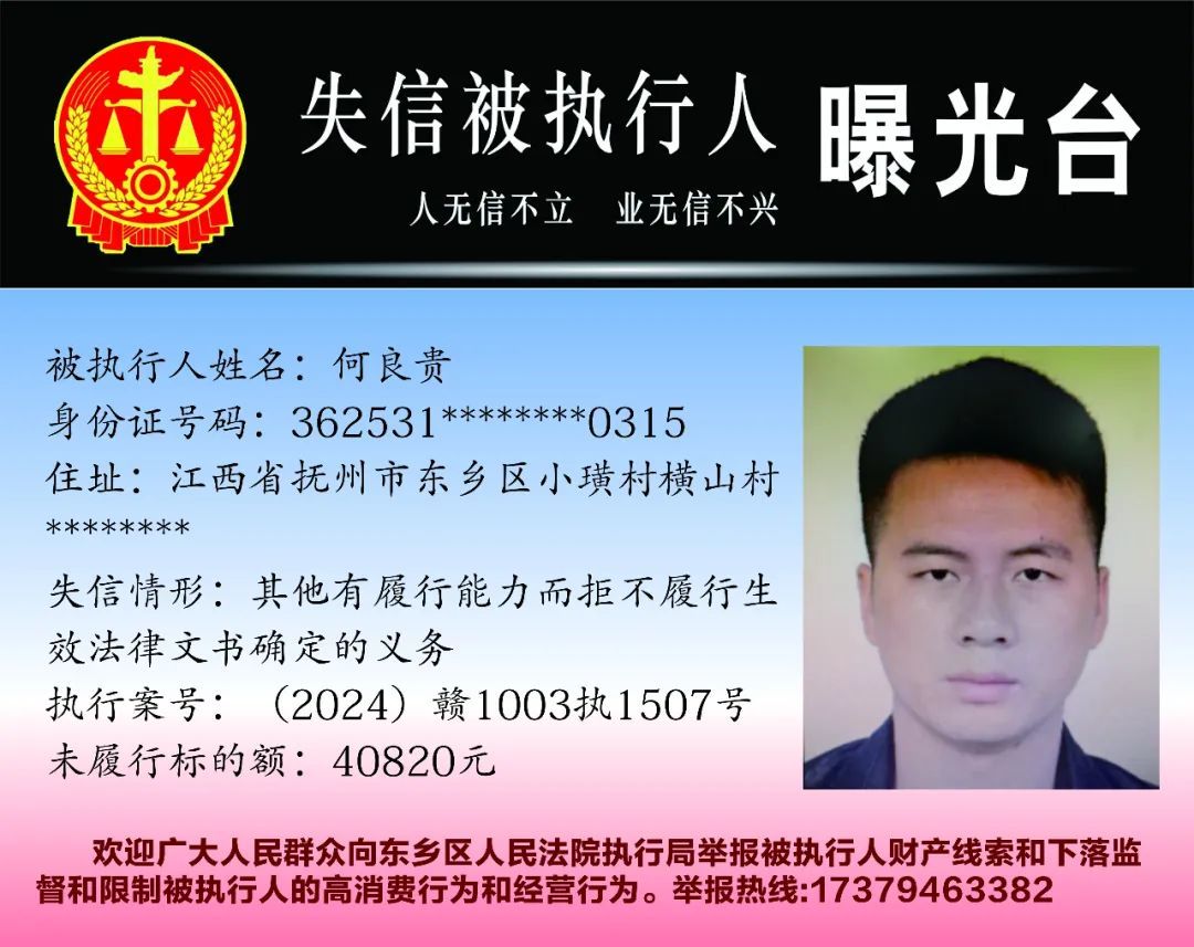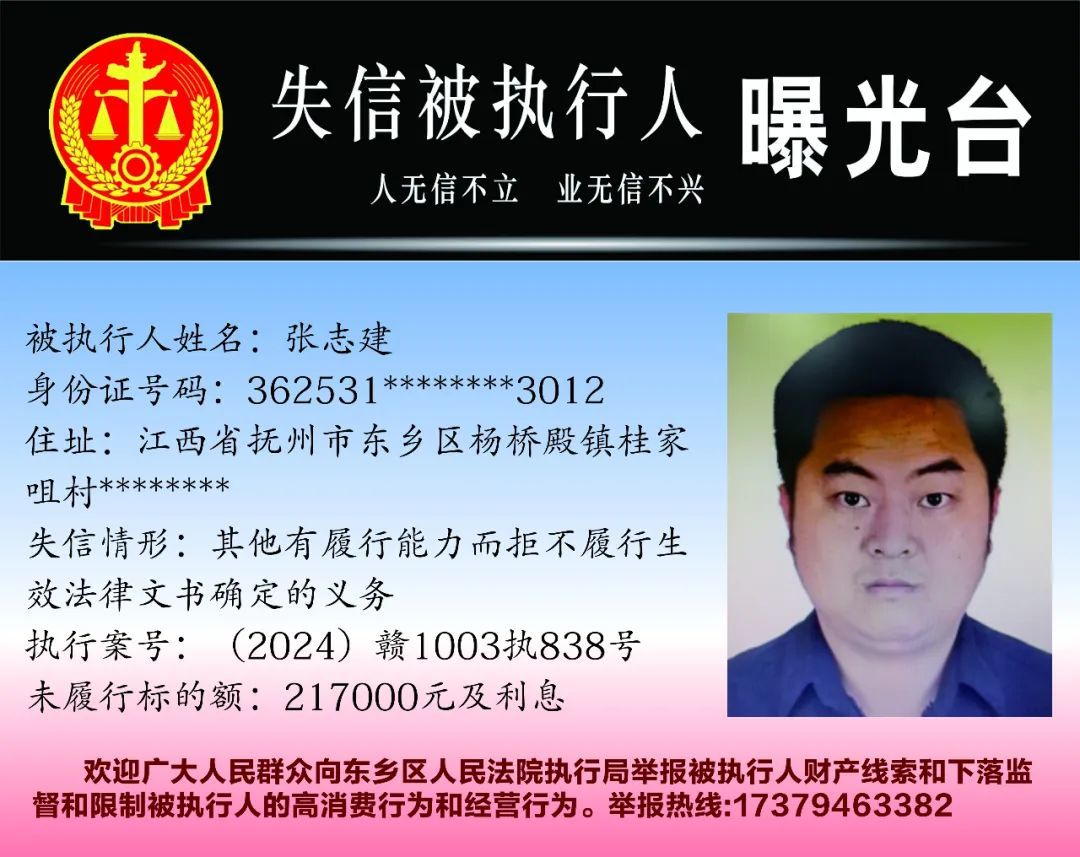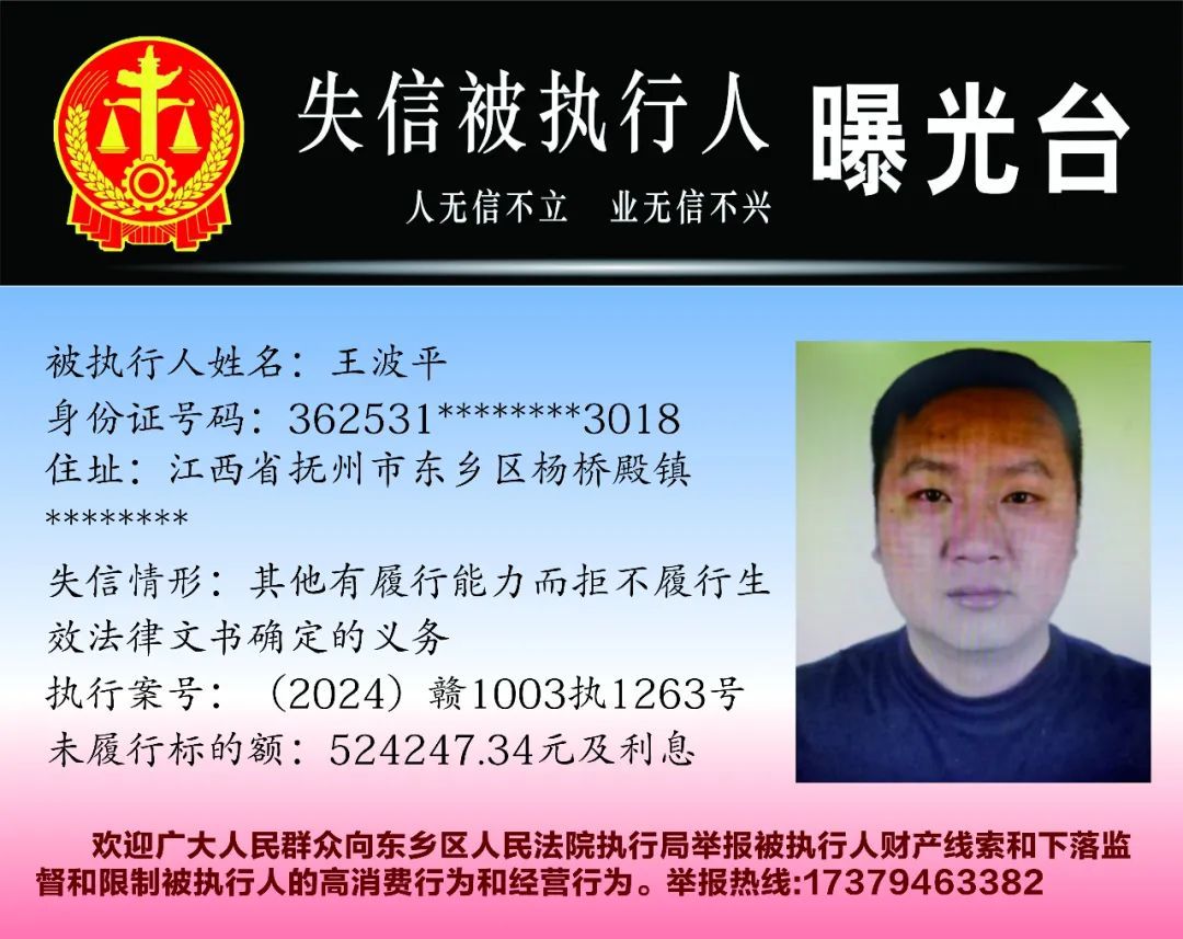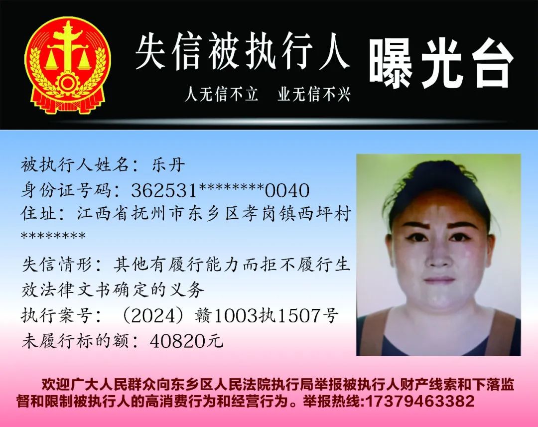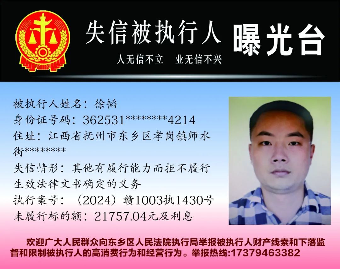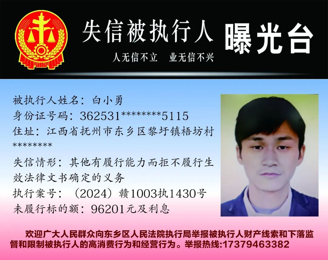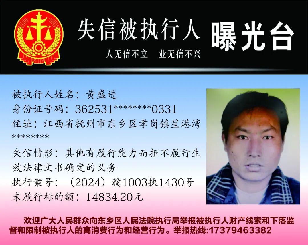 为促使被执行人自觉履行生效法律文书确定的义务,推进社会诚信建设,贯彻落实我省“执行长效机制巩固年”专项活动,抚州市东乡区人民法院根据《中华人民共和国民事诉讼法》《最高人民法院关于公布失信被执行人名单信息的若干规定》等相关法律和规定,决定对下列失信被执行人予以曝光。