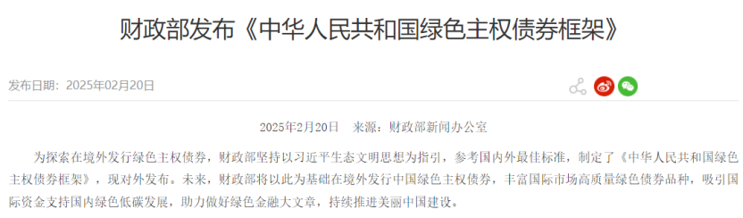 财政部2月20日公布《中华人民共和国绿色主权债券框架》(下称《框架》),《框架》是财政部作为国际绿色债券发行人的基石文件。此前,第十一次中英经济财金对话政策成果透露,中方同意2025年发行首笔人民币计价的绿色主权债券,并在伦敦挂牌上市,这将是中国在英发行的首笔绿色主权债券。