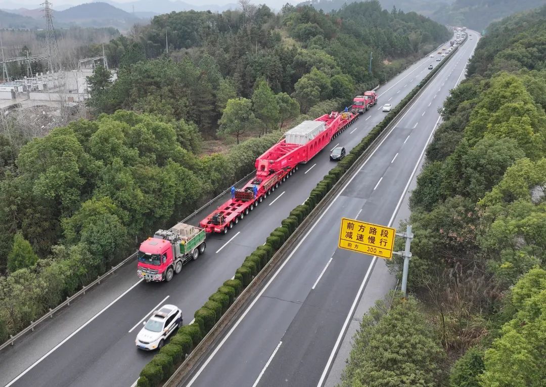 此次运输设备为上高电厂主变压器,采用液压平板桥式车组运输,从新余东收费站出发,经沪昆高速、大广高速、G320国道等路段,到达江西赣能上高发电有限公司,全程83余公里,历时9小时。