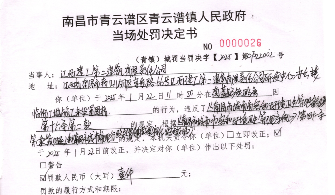 民警随即联合相关部门通知业主单位以及施工单位立即整改,严格按照各自承担的安全生产监管管理职责、法律法规和相关技术要求,做好施工现场交通安全防护设置,并对江西建工第二建筑有限责任公司进行了当场处罚。