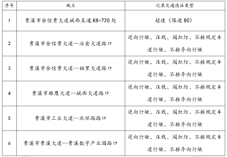 为强化我市道路交通组织与管理,全面推进公安交通管理工作科技化、信息化,为我市社会发展构建平安、和谐、畅通的道路交通环境,根据《中华人民共和国道路交通安全法》等相关法律规定,贵溪市公安局交通警察大队对我市6处道路交通监控设施的点位进行通告。