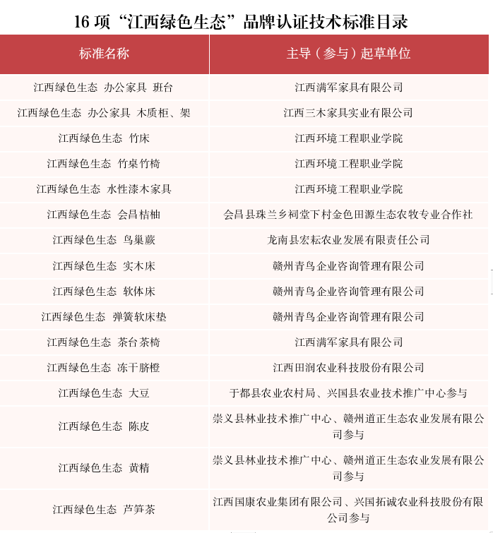 近日,江西绿色生态品牌建设促进会发布了27项“江西绿色生态”品牌认证技术标准,赣州主导和参与制定的《江西绿色生态 水性漆木家具》《江西绿色生态 会昌桔柚》《江西绿色生态 冻干脐橙》等16项标准位列其中,占全省发布总量的59%,标准涉及现代家居、食品、农产品等特色优势产业领域。截至目前,我市已累计制定“江西绿色生态”43项,数量居全省第一,为助推全市“7510”和全省“1269”重点产业链转型升级注入强劲“绿色”动能。