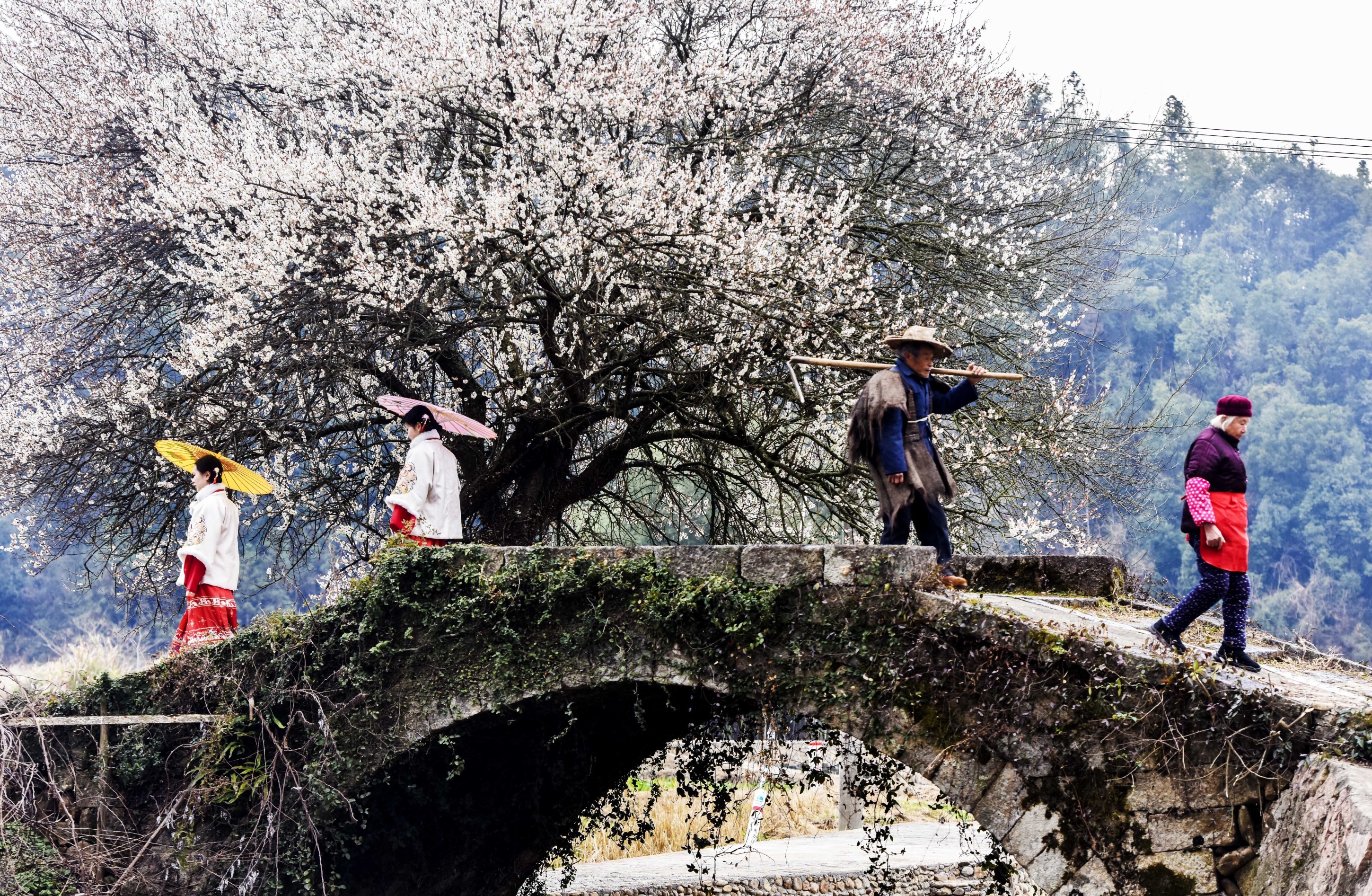日前,游客在资溪县嵩市镇抚地村千年古桥上赏花拍照。该村古桥头石壁缝里自然生长着一棵梅花树,虽经百年风雨仍傲然挺立,村民自发将古树根部周围重新砌石护坡加固、细心呵护。每当冬春交替时节,古桥、梅花吸引众多游客前来踏青赏花。通讯员吴志贵摄