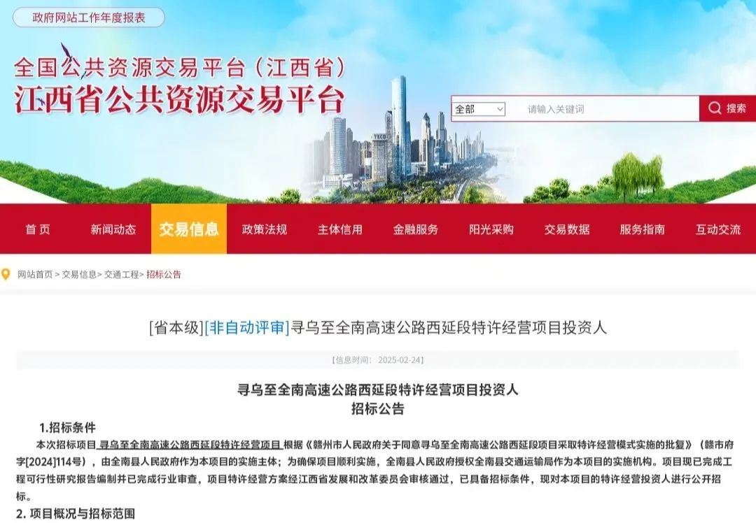 寻乌至全南高速公路西延段项目位于江西省赣州市南部,起点位于大广高速全南互通以北2公里处,途经龙南、全南两县(市),由全南县南迳镇出省,顺接广东省规划的韶关至全南高速公路,对于改善赣南东西向交通通行条件,完善江西省高速公路网络布局具有重要意义。该项目全线约53.5公里,设计速度100公里/小时,采用双向四车道高速公路标准,路基宽度26米。项目设置互通式立交4处、服务区1处、连接线2000米/3处,总投资约73.8亿元,采用建设-运营-移交(BOT)方式实施。