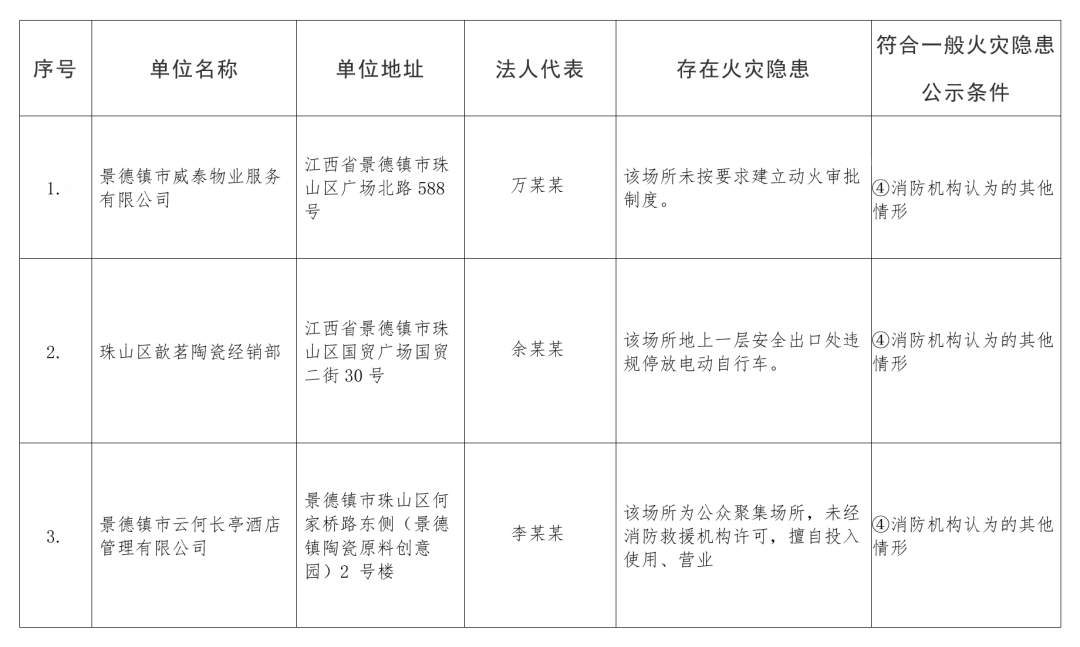 为预防和遏制较大及以上火灾事故的发生,切实维护公共消防安全,现景德镇市消防部门对排查整治中存在一般火灾隐患的社会单位进行公示,涉及单位有3家。