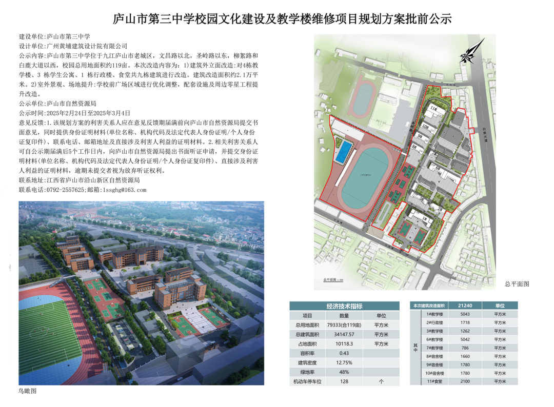 设计单位:广州黄埔建筑设计院有限公司公示内容:庐山市第三中学位于九江庐山市老城区,文昌路以北,圣岭路以东,柳絮路和白鹿大道以西,校园总用地面积约119亩。本次改造内容为:1)建筑外立面改造:对4栋教学楼、3栋学生公寓、1栋行政楼、食堂共九栋建筑进行改造。建筑改造面积约2.1万平米。2)室外景观、场地提升:学校前广场区域进行优化调整,配套设施及周边零星工程提升改造。