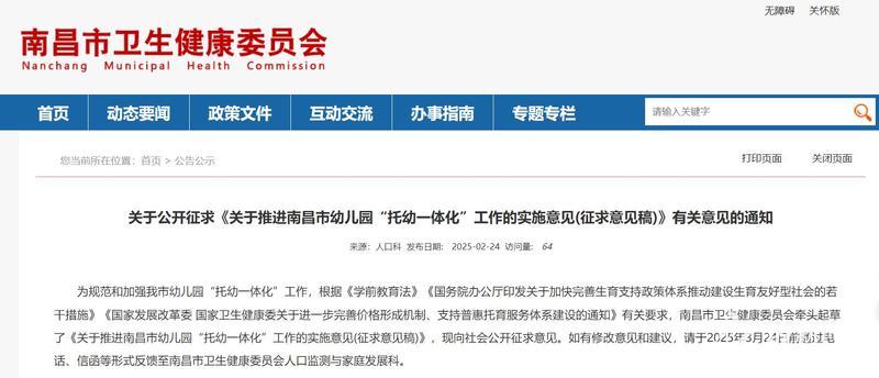 江西新闻客户端讯(全媒体记者朱叶)2月27日,记者从南昌市卫生健康委获悉,《关于推进南昌市幼儿园“托幼一体化”工作的实施意见(征求意见稿)》日前发布,面向社会公开征求意见。征集日期截至2025年3月24日。相关意见建议可通过电话或信件反馈(联系电话:83987029,通信地址:南昌市红谷滩区会展路199号红谷大厦A座5楼)。