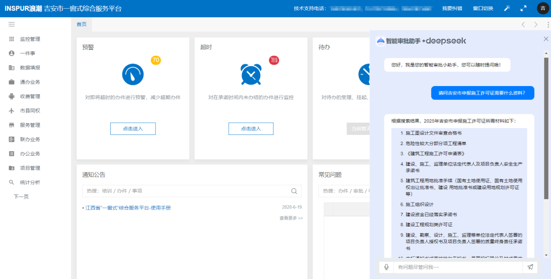 2月28日,吉安市基于一窗式审批系统和工改审批系统,正式上线全省首个搭载DeepSeek认知大模型AI政务服务助手,实现了政务服务与前沿AI大模型的技术融合,这一创新举措标志着吉安正式迈入“吉事即办”AI服务时代。