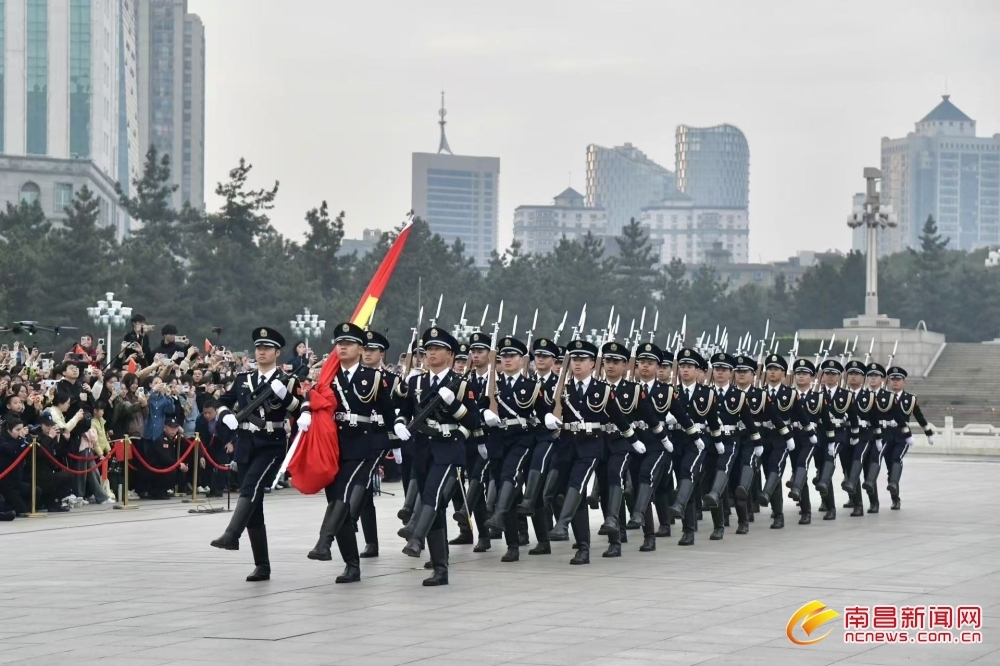 7时30分,激昂的《歌唱祖国》旋律准时奏响,八一广场瞬间庄严肃穆,由南昌市公安局警旗队组成的国旗护卫队,迈着矫健有力的步伐,从八一南昌起义纪念塔下东侧候场区英姿飒爽地出发。他们步伐坚定,整齐划一的脚步声在广场上回荡,沿着金水桥护送五星红旗走向国旗台。