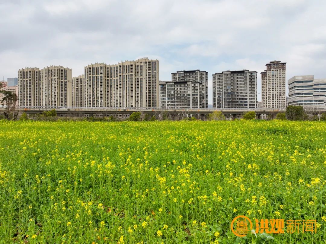 在南昌东站以南的淮安路上,一片金灿灿的油菜花田吸引众多游客的目光。微风拂过,金黄色的花浪翻滚,游客可以在花田中驻足拍摄,拍下一张张充满春天气息的照片。 现代交通枢纽与自然生态的完美融合,传递出绿色、生态、和谐的城市发展理念。