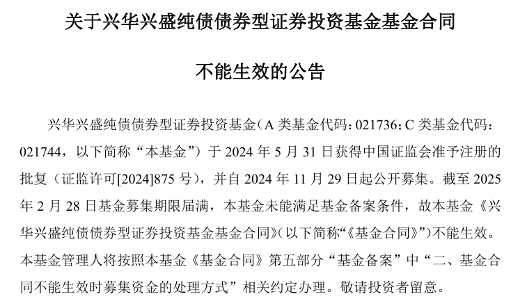 3月1日,兴华基金公告称,截至2025年2月28日基金募集期限届满,兴华兴盛纯债基金因未能满足基金备案条件,故基金合同不能生效。
