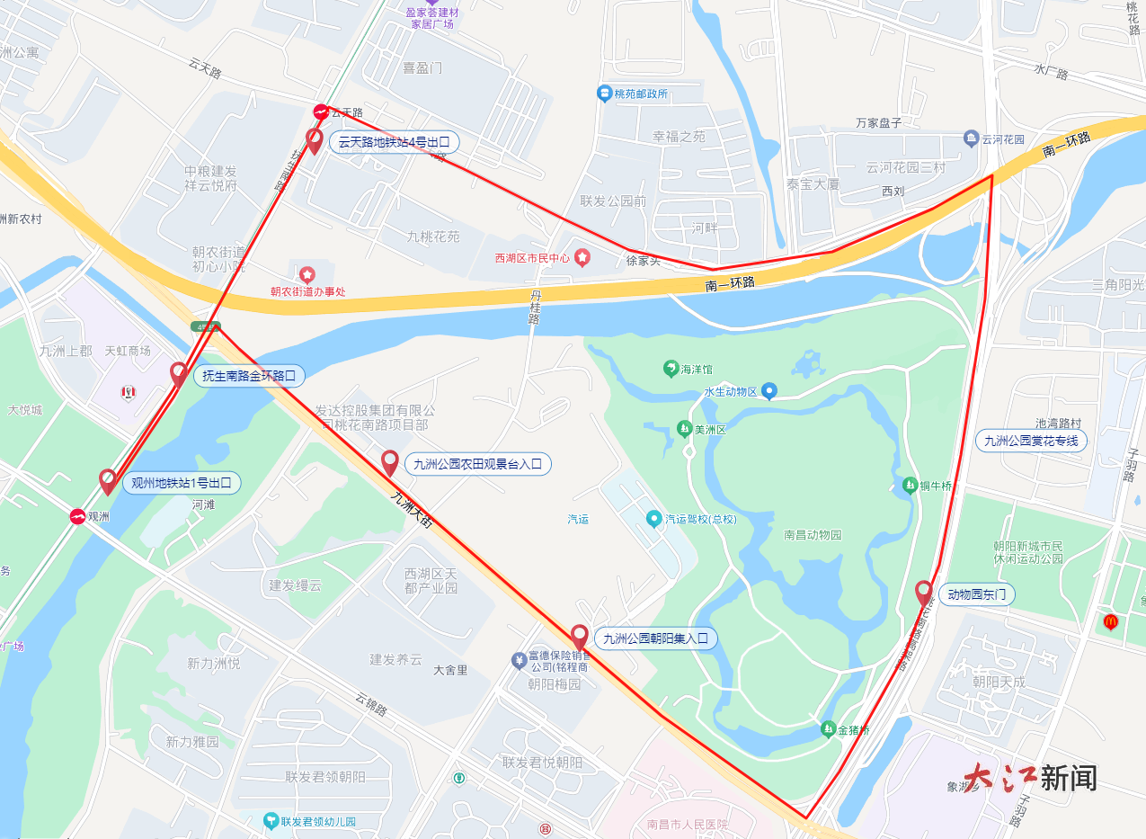 停靠站点:观州地铁站(1号出口)、云天路地铁站(4号出口)、南昌动物园东门、九洲公园朝阳集入口、九洲公园农田观景台入口、抚生南路金环路口、观州地铁站(1号出口)。