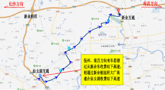 管制内容:往抚州、南昌方向在新余收费站上高速匝道;从宜春、长沙方向来车在新余收费站下高速匝道。