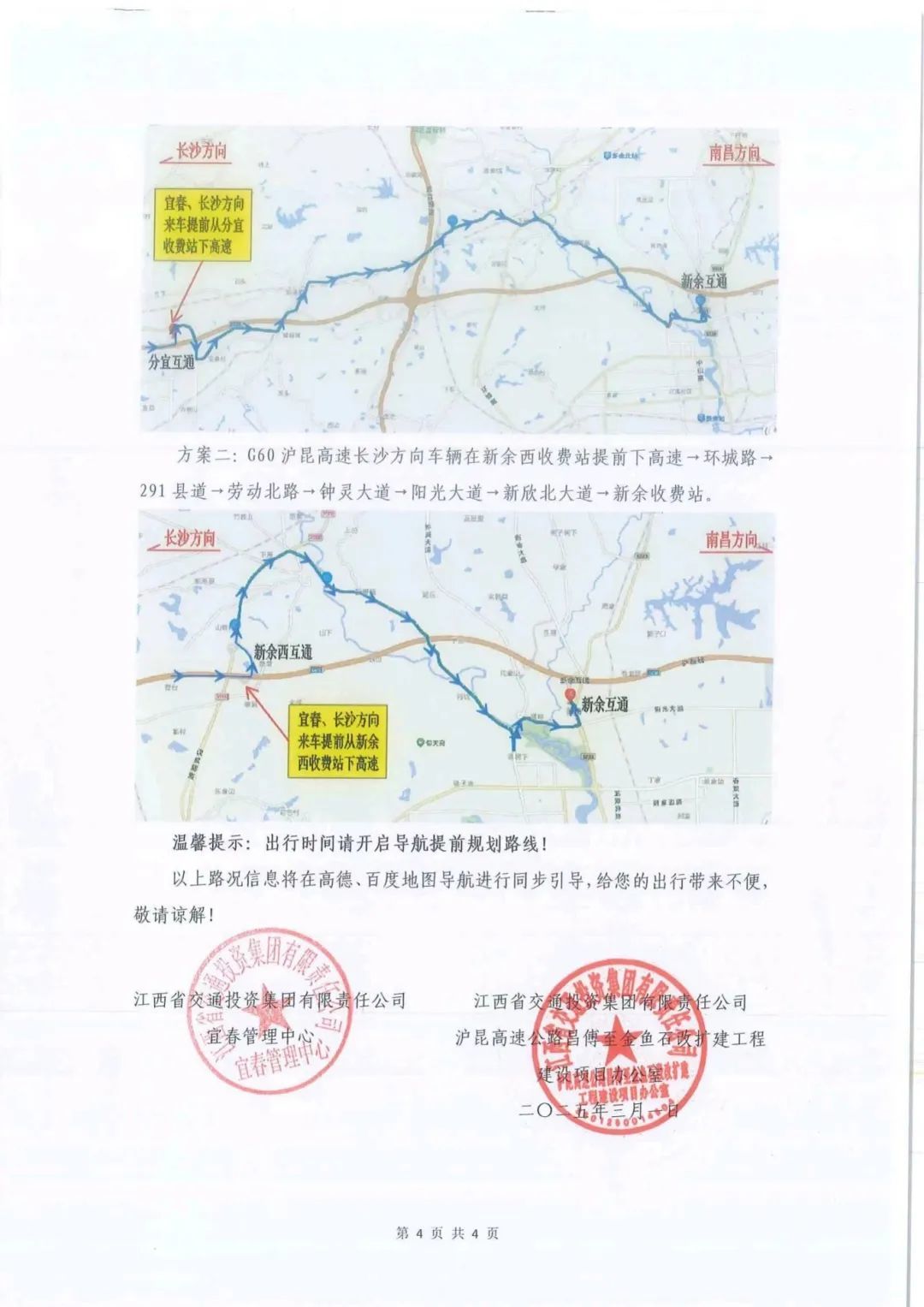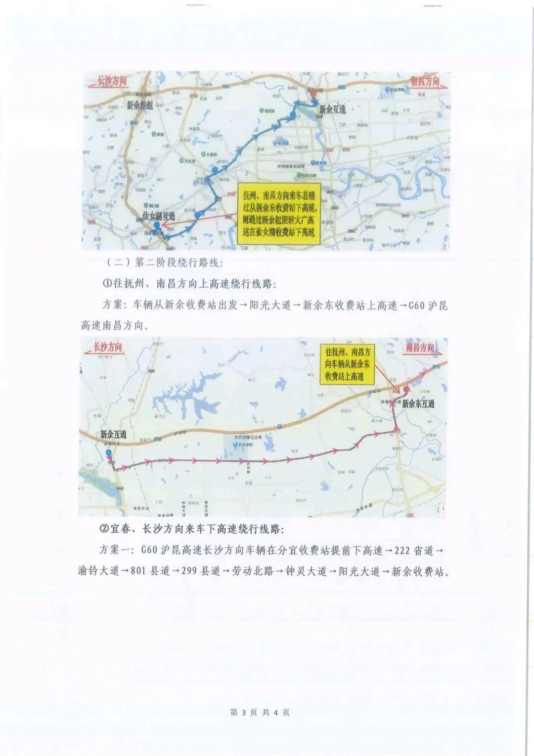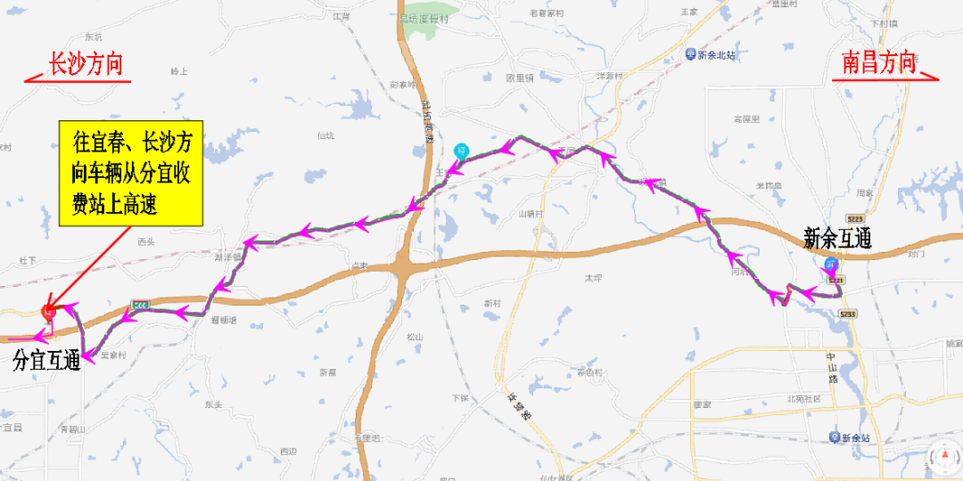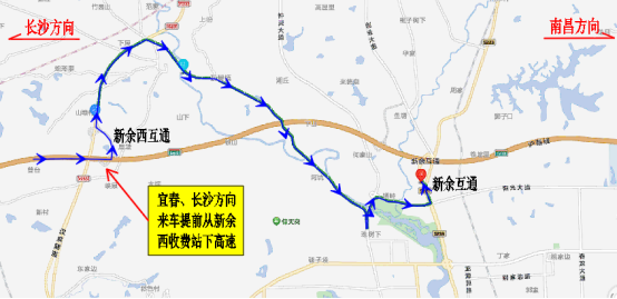 方案一:G60沪昆高速长沙方向车辆在分宜收费站提前下高速→222省道→渝钤大道→801县道→299县道→劳动北路→钟灵大道→阳光大道→新余收费站。