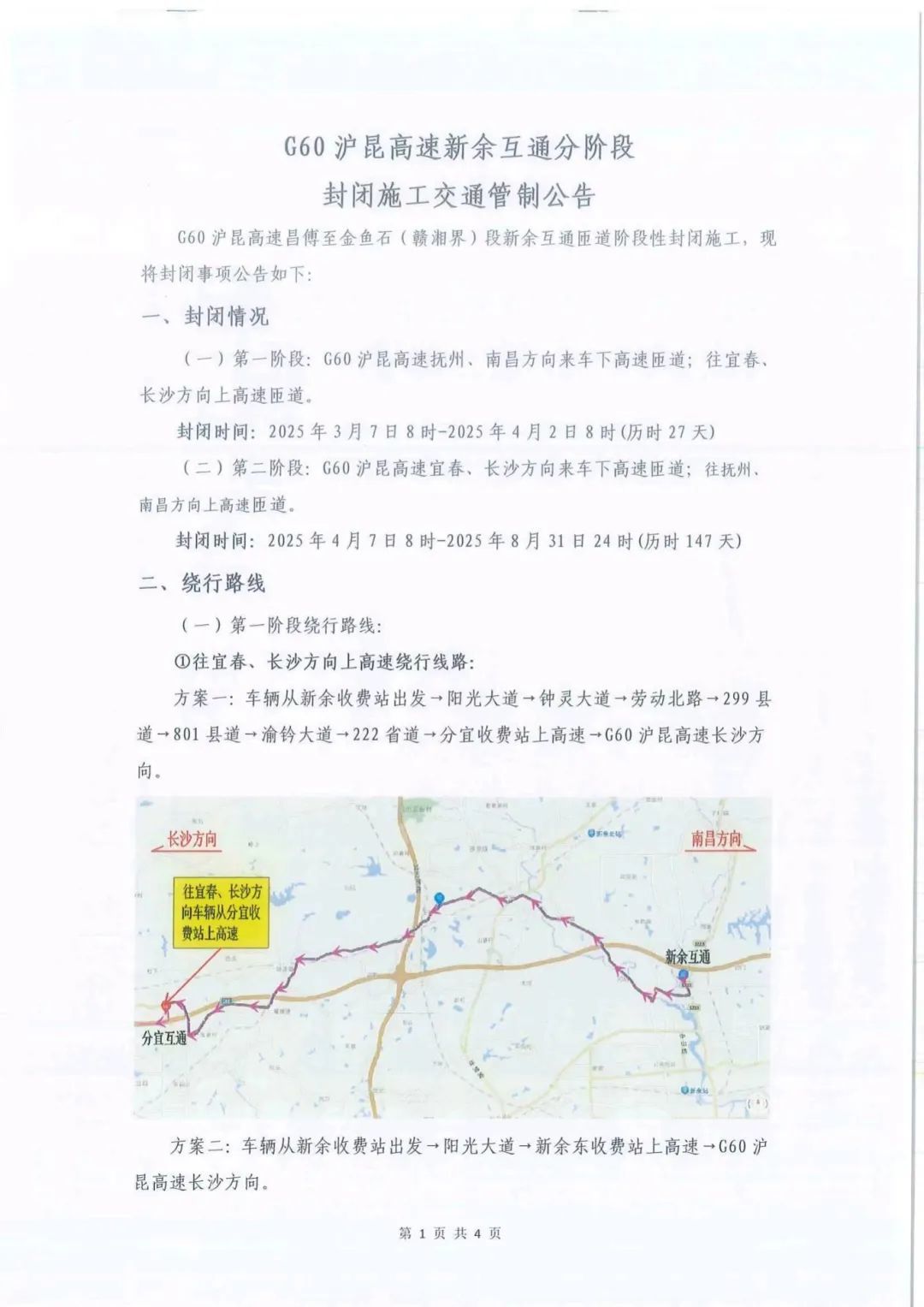 因G60沪昆高速昌傅至金鱼石(赣湘界)段改扩建工程施工,需对新余互通分阶段封闭施工交通管制,现将封闭事项公告如下:
