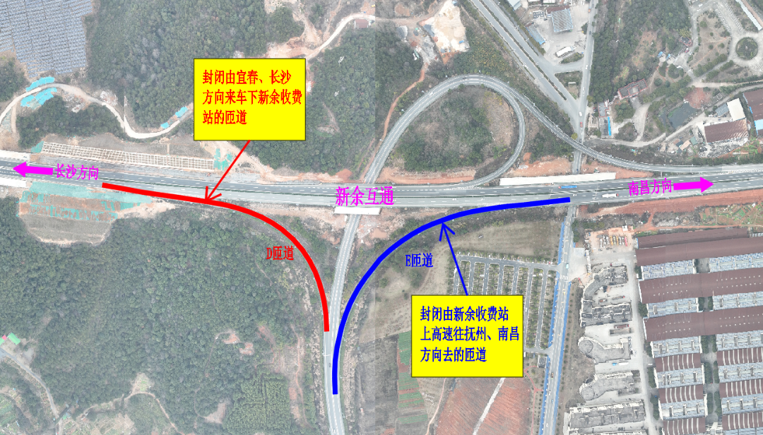 管制内容:往宜春、长沙方向在新余收费站上高速匝道;从抚州、南昌方向来车在新余收费站下高速匝道。