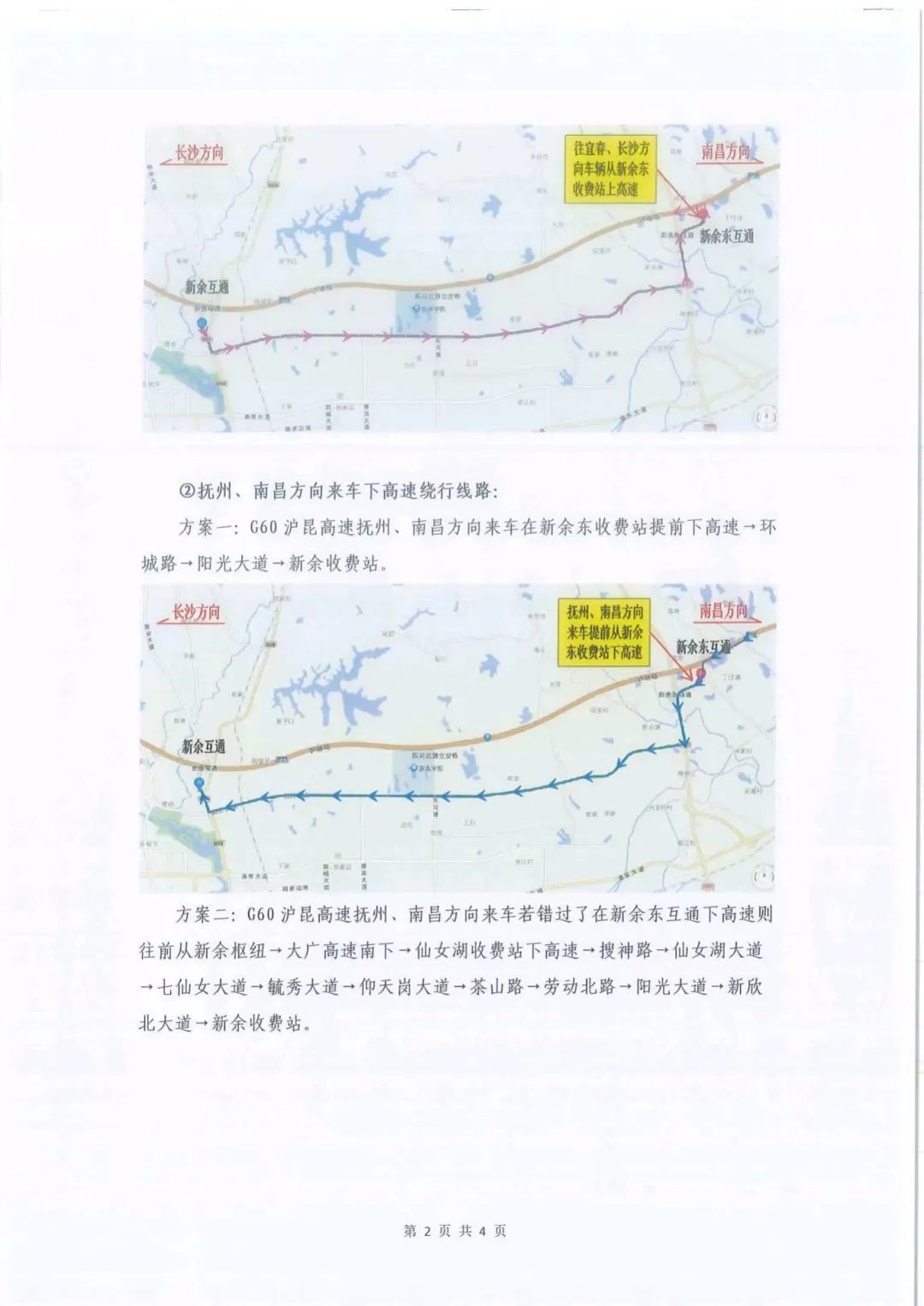 方案二:G60沪昆高速长沙方向车辆在新余西收费站提前下高速→环城路→291县道→劳动北路→钟灵大道→阳光大道→新欣北大道→新余收费站。