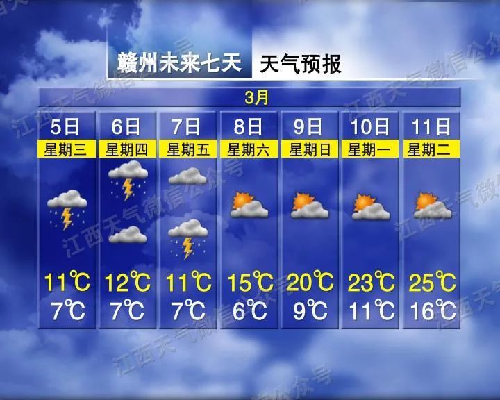 赣南阴天有阵雨或雷阵雨