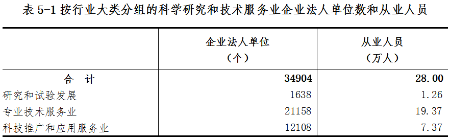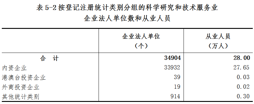 在科学研究和技术服务业企业法人单位从业人员中,内资企业占98.7%,港澳台投资企业占0.1%,外商投资企业占0.1%(详见表5-2)。