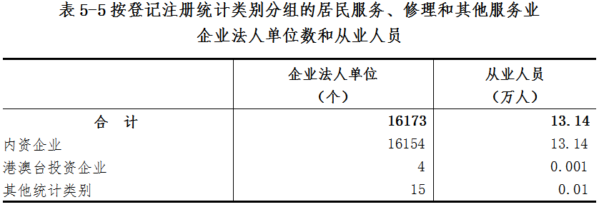 在居民服务、修理和其他服务业企业法人单位从业人员中,内资企业占99.9%,港澳台投资企业占0.01%(详见表5-5)。