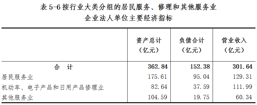 2023年末,居民服务、修理和其他服务业企业法人单位资产总计362.84亿元,比2018年末增长87.9%;负债合计152.38亿元,比2018年末增长56.5%。全年实现营业收入301.64亿元,比2018年增长118.8%(详见表5-6)。