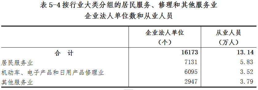 2023年末,全省共有居民服务、修理和其他服务业企业法人单位16173个,从业人员13.14万人,分别比2018年末增长107.0%和76.0%(详见表5-4)。