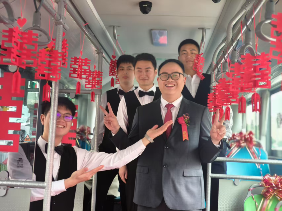 公交车内,新娘凤冠霞帔,明艳动人;新郎一身笔挺西装,帅气十足。伴娘伴郎们笑容满面,车厢里洋溢着满满的幸福与喜悦。此次,金溪分公司挑选新能源电动公交车参与“公交婚车”保障运输,并结合车身优势精心装饰,打造个性化的婚车服务,倡导低碳环保的婚俗新风尚。新人可根据喜好装饰车辆,车载电视音响可以播放新人提前准备的视频或音乐,满足个性化需求。