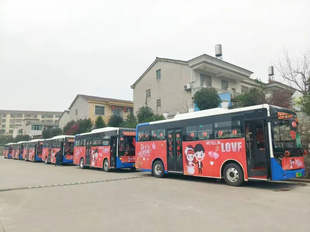 3月9日上午,抚州长运金溪分公司六辆喜庆的公交车缓缓穿过热闹的街道,车身满是红色元素,车头系着红花,车窗贴着大红囍字,原来是一对新人用公交车当作“婚车”。路旁行人纷纷投来好奇目光,有人感叹:“这是谁家的孩子结婚?用公交车当婚车,真特别又环保,等我家孩子结婚,也考虑这么办!”