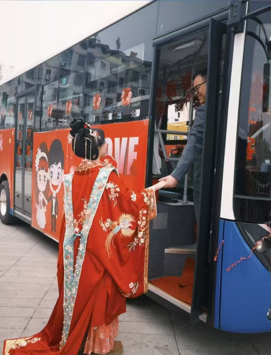 如今,公交婚车凭借其独特、环保、经济等优势,正逐渐成为年轻人的新选择,未来有望在婚庆市场中占据更大份额。谈及选择公交婚车的缘由,新人脸上洋溢着幸福笑容:“这种迎亲方式新颖独特,公交婚车环保又时尚,响应政府移风易俗、低碳环保的号召,在亲朋好友的陪伴下热热闹闹完婚,特别满足开心,家里人也都很支持。车内装饰都是我们精心挑选的,幸福感满满。”