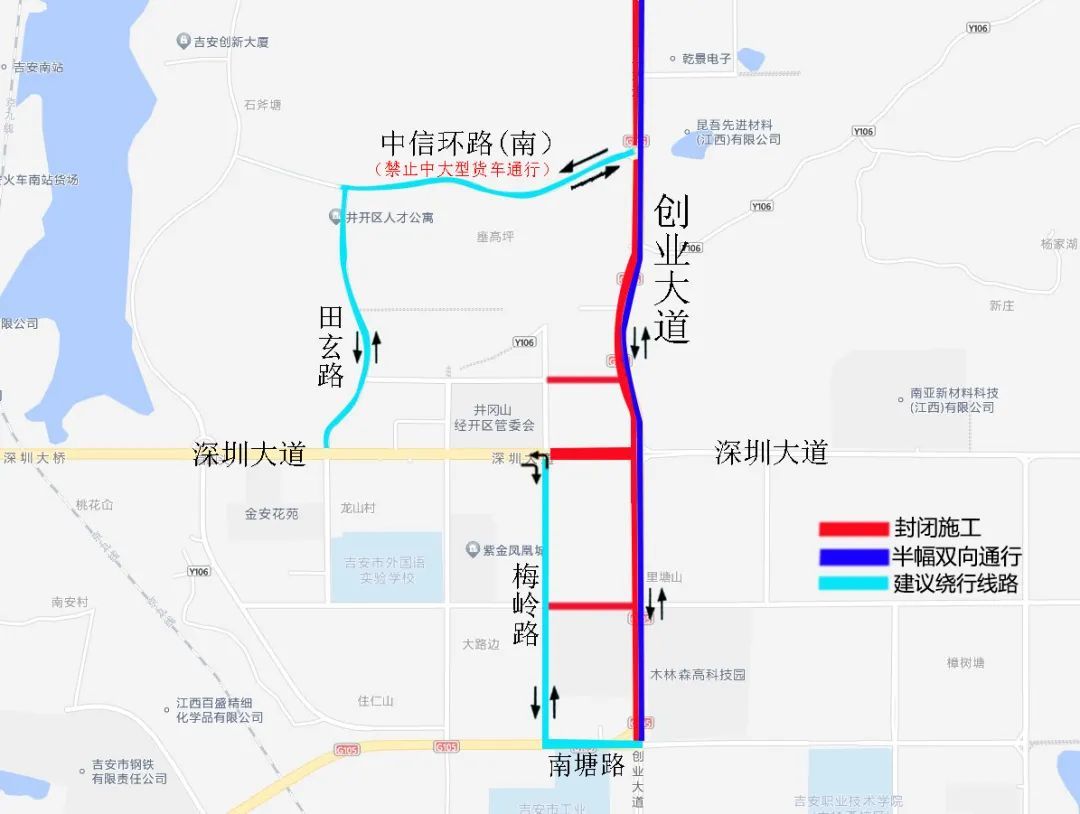 三、管制措施:创业大道(庐陵大道路口至南塘路路口段)西侧半幅封闭施工,东侧半幅道路实行双向通行,临时开通创业大道与中信环路南路交叉路口供车辆绕行。