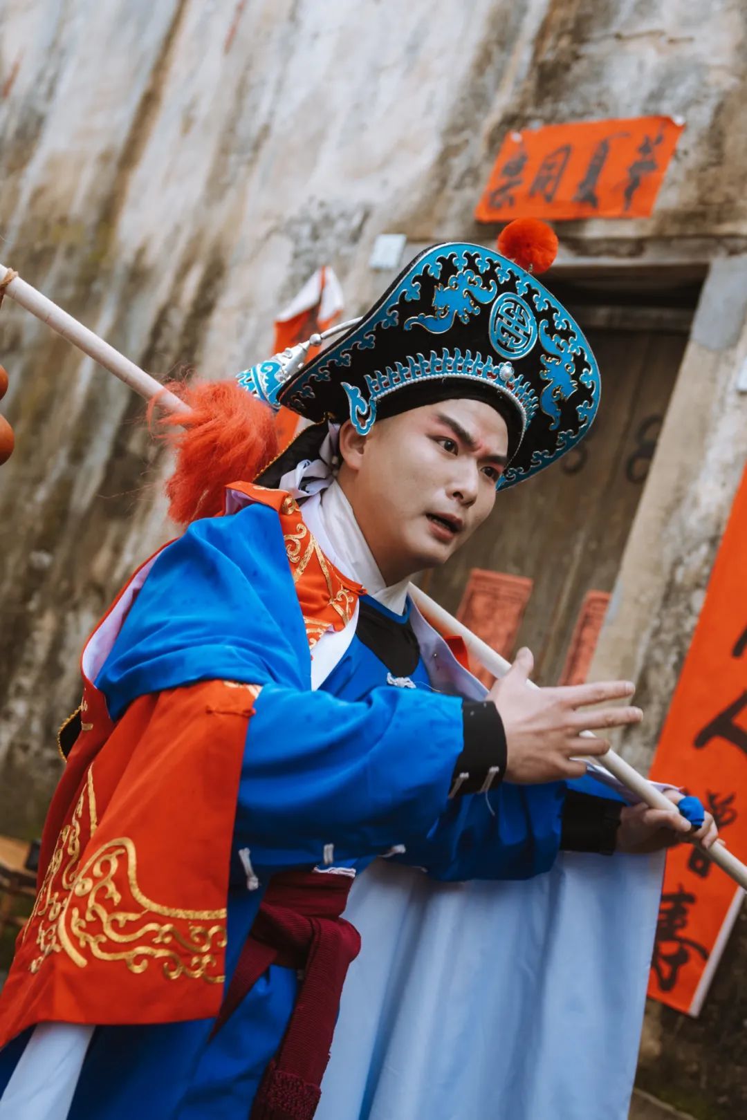 白天的陶阳庙会是属于“非遗”的。弯弯绕绕的里弄间,不时传来阵阵欢呼和掌声,循着声音走近一瞧,原来乐平的古戏台搬进了丰城会馆,正上演着一出出经典赣剧,台下观众看入了迷;龙缸弄弄口,川剧变脸演员绕场一周,大袖一挥,脑袋一转,“唰唰”几下,脸谱不停变换,赢得场下连连叫好;黄老大窑里,只见四五个椅子堆起几米高,凳顶师傅在最高处下腰、倒立,看得人心惊称奇……还有弋阳腔、皮影戏、顶缸等众多非遗杂技戏剧,让人大饱眼福。
