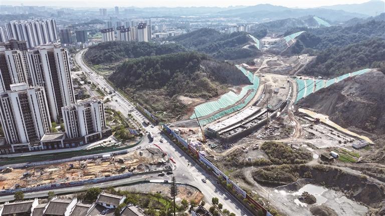 3月17日,上饶大道提速改造及灵山互通连接线施工现场呈现出一派热火朝天的繁忙景象。该项目一期工程于2024年3月开工。工程起点与天佑大道衔接,终点与沪昆高速灵山互通收费站衔接。路线全长约5.1公里,主线为双向六车道,设计时速为60公里。(记者 戴越 摄)