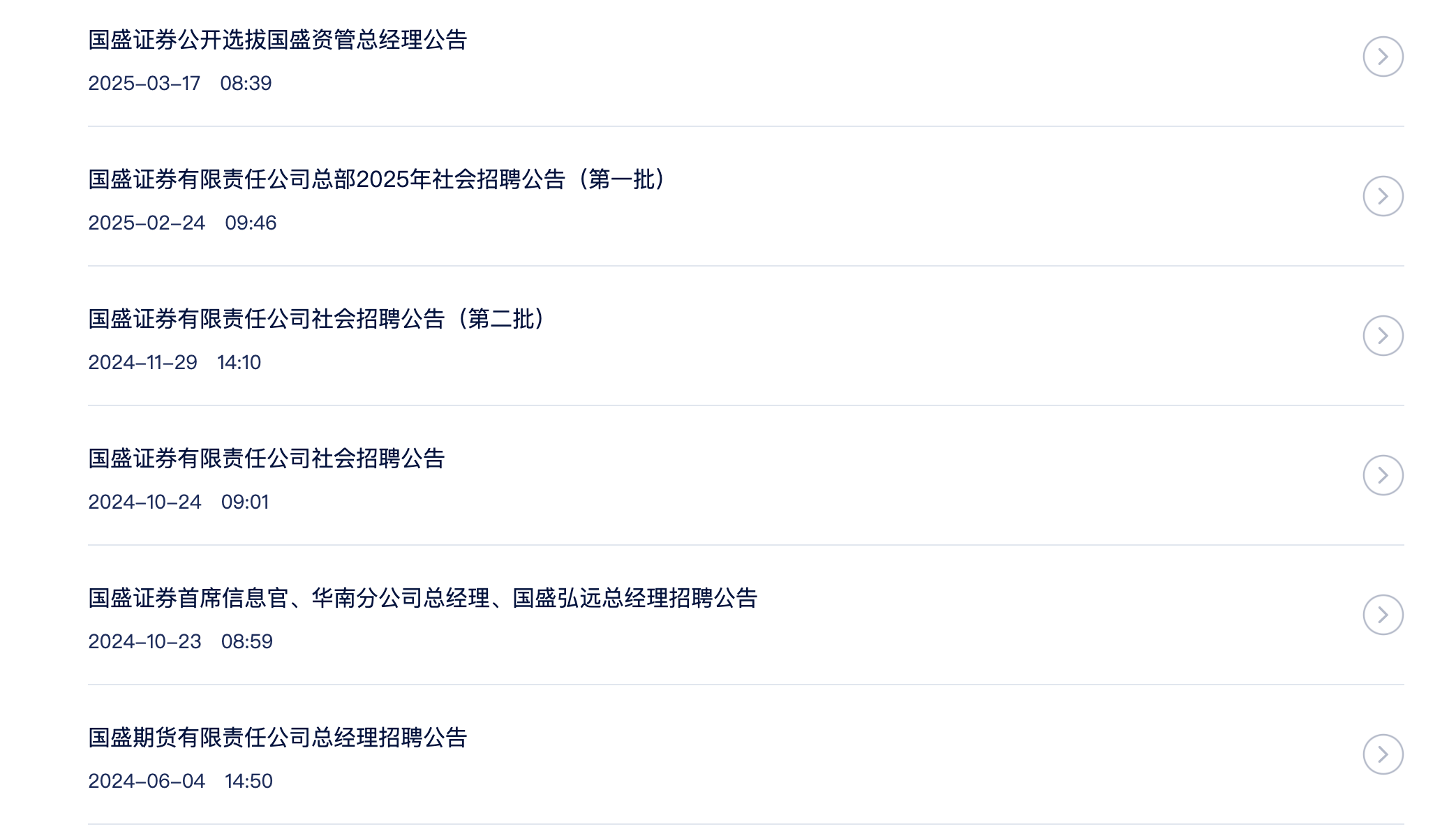 记者注意到,此次公开选聘延续了国盛证券近年来人才强企战略转型方向。去年以来,国盛证券先后启动了多轮公开招聘。比如2024年6月,曾向社会公开招聘国盛期货总经理;2024年10月,又曾向社会公开招聘国盛证券首席信息官、国盛证券华南分公司总经理以及国盛弘远总经理;2025年2月,又因发展需要,面向社会公开招聘12人,涵盖固定收益总部、金融市场总部、研究所等部门。