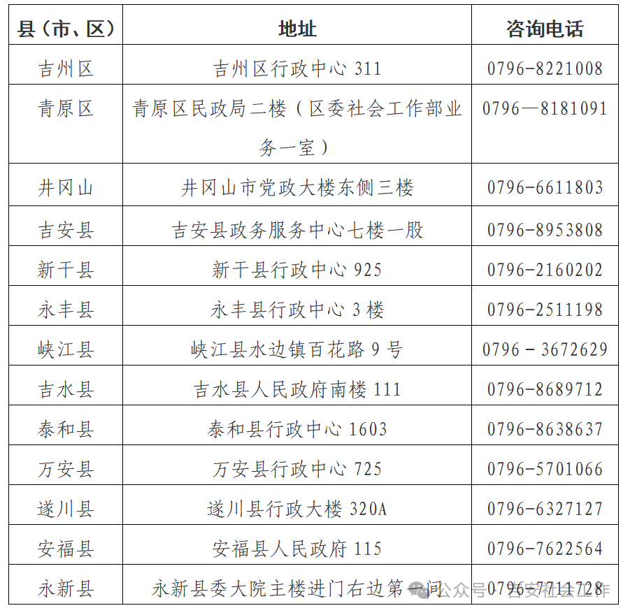各县(市、区)委社会工作部地址及咨询电话如下(工作日8:30—12:00 14:00—17:30):