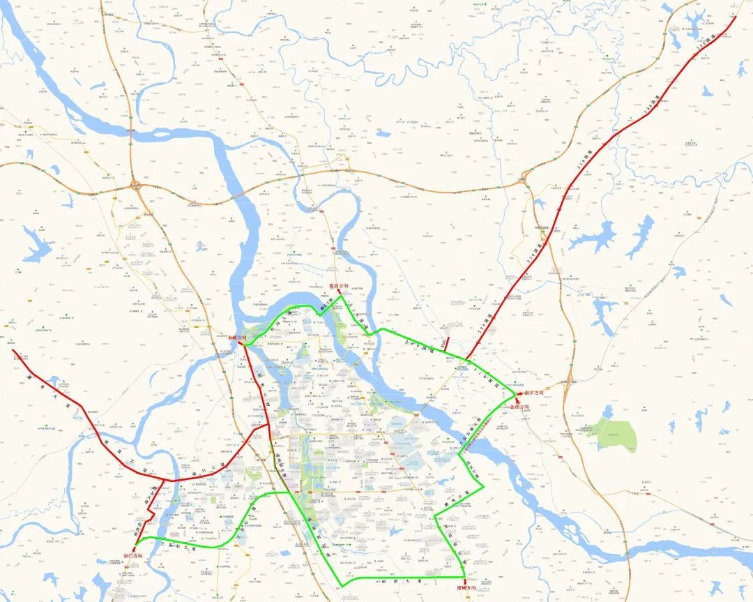 1、市城区范围:自赣东大桥北端引桥交叉路口,沿316国道、王安石特大桥(危化品车辆禁行)、汝水大道、栖凤大道、文昌南大道、创新大道、汤显祖大道、西津大道、抚北东路、抚河大道、赣东大桥等,划定为中型及以上货车过境绕城环路。
