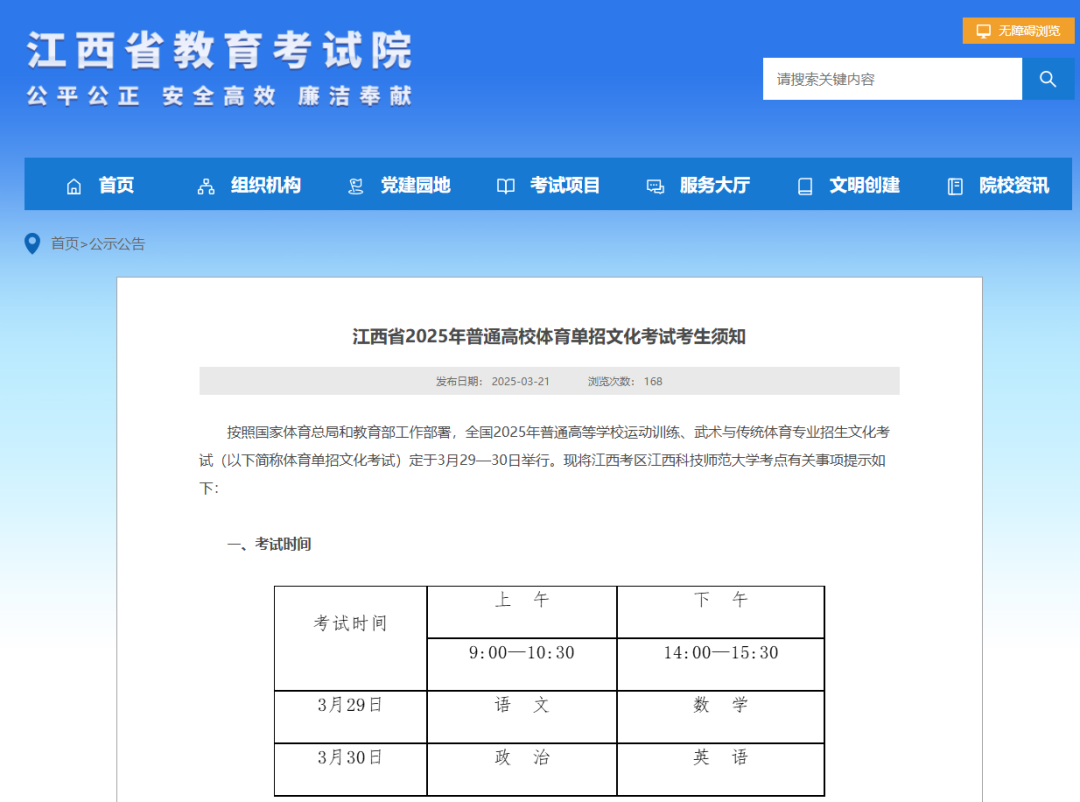 按照国家体育总局和教育部工作部署,全国2025年普通高等学校运动训练、武术与传统体育专业招生文化考试(以下简称体育单招文化考试)江西考区将于3月29日-30日在江西科技师范大学举行考试。3月21日,省教育考试院就有关事项提示如下: