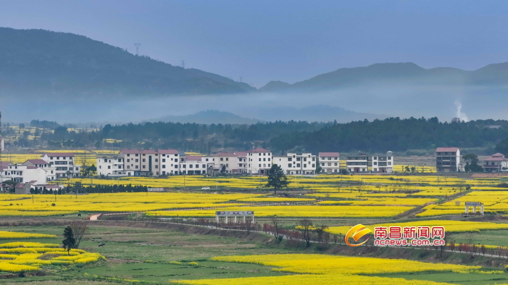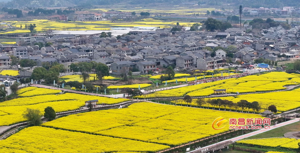 南昌新闻网讯 3月24日,安义古村油菜花恣意绽放,金浪翻涌间,无人机俯瞰下,古村周围花海如织锦铺展,远山如黛,烟岚轻笼,游人穿梭在金黄的花海间流连忘返。(洪观新闻记者 魏勇剑 李珍福 侯欣伟 摄)