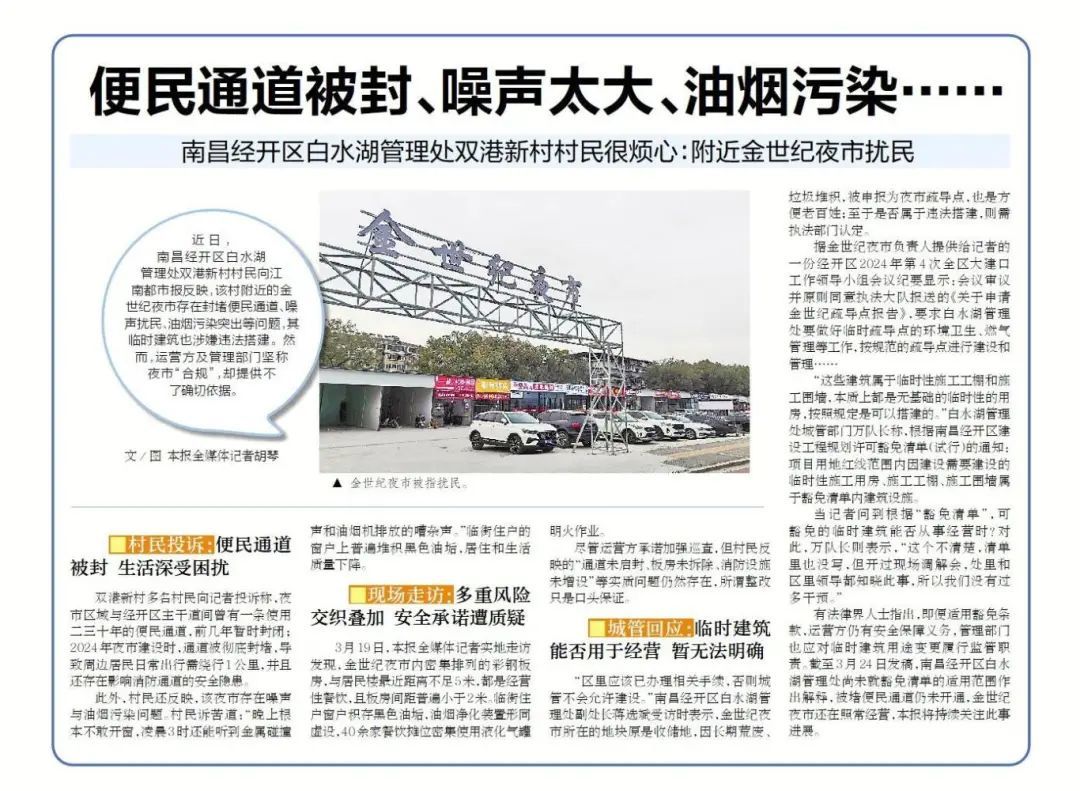 近日,南昌经开区白水湖管理处双港新村村民向江南都市报反映,该村附近的金世纪夜市存在封堵便民通道、噪声扰民、油烟污染突出等问题,其临时建筑也涉嫌违法搭建。然而,运营方及管理部门坚称夜市“合规”,却提供不了确切依据。