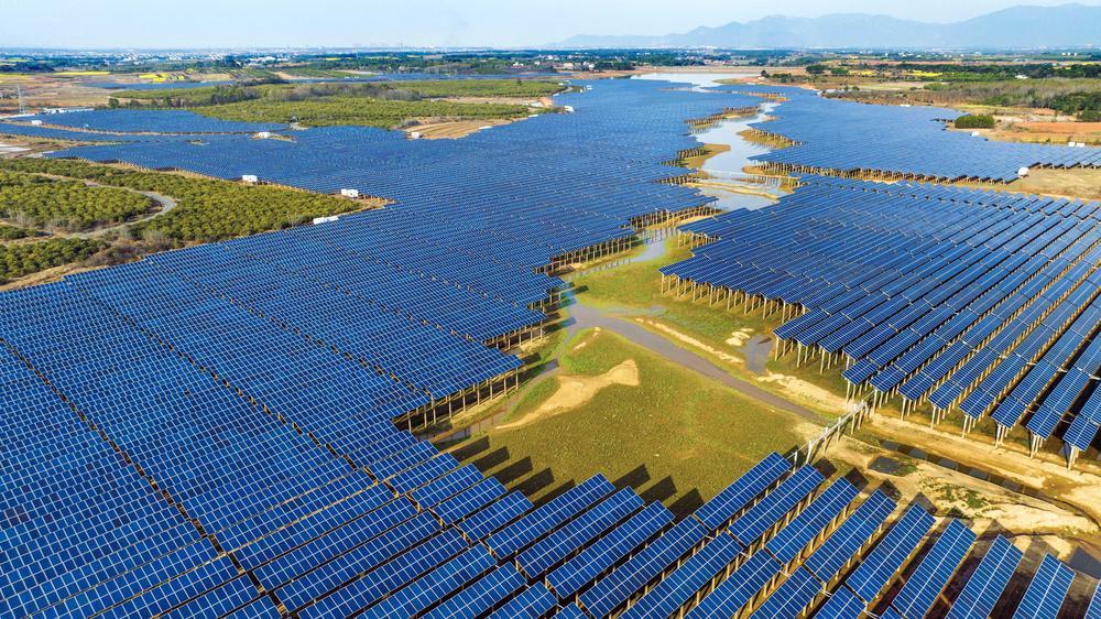 3月19日,奉新县跃进湖“渔光互补”光伏电站在阳光照耀下熠熠生辉。