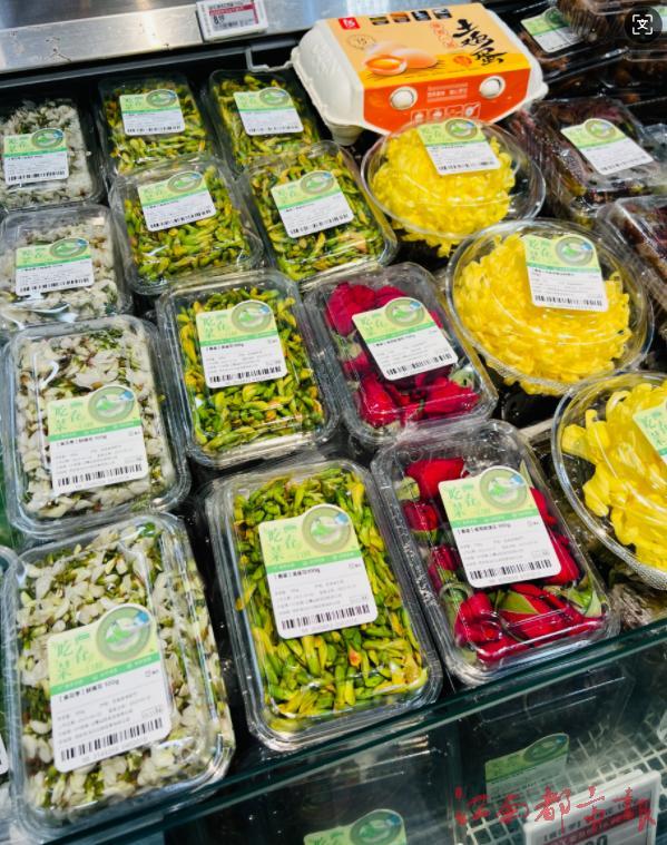 在门店蔬菜区,十几款可食鲜花打上了“春菜”标签,除了常见的黄瓜花、槐花、茉莉花,还有石斛花、棠梨花、海菜花等很难叫出名字的品类,红、黄、橙、白,颜色俏丽,赏心悦目。