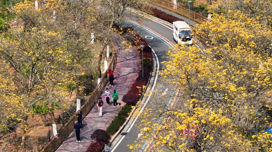 4月3日,龙南市南武当山景区游步道旁的大片黄花风铃木花开枝头,满树金黄,为春意盎然的景区增添了一抹亮丽的色彩。游客们漫步其中,纷纷举起手机,记录下这烂漫美景。赖胜烽 摄