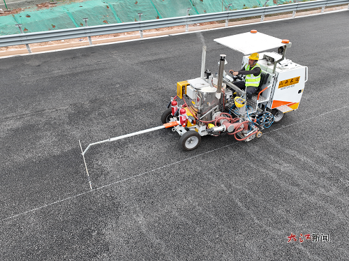大江网/大江新闻客户端讯 全媒体记者谢梦丽报道:4月7日,记者获悉,昌金改扩建工程引入“预标线机器人+智能乘驾式热熔划线机”组合施工工艺,预标线机器人通过前端GPS完成数据采集后,可自动实时生成标线参数,机器人根据参数自动进行预标线绘制,无论是曲线、折线,还是复杂的图案标识,均能呈现。