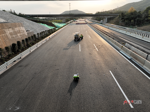据介绍,因改扩建工程采用“边施工边通车”模式,对路面施工周期有严格的要求。传统热熔型雨夜反光标线施工工艺较为复杂,且由于人为因素干扰较多,易导致标线厚度、结构、尺寸、线形等方面的缺陷。为优化路面标线施工,昌金改扩建项目在全省改扩建项目中率先引入“预标线机器人+智能乘驾式热熔划线机”组合数智化标线施工工艺。其高精度的作业能力,极大减少了人工标线可能出现的误差,为后续的热熔划线提供了精准的基础,确保每一条标线都符合严格的交通规范标准,且划线效率是传统人工的2.5倍。