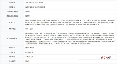 大江网/大江新闻客户端讯 全媒体记者谢梦丽报道:近日,江西省投资项目在线审批监管平台公示了南昌市社区嵌入式体育场馆工程备案信息。该项目总投资22954.6万元,预计开工时间为2025年6月,竣工时间为2025年11月。