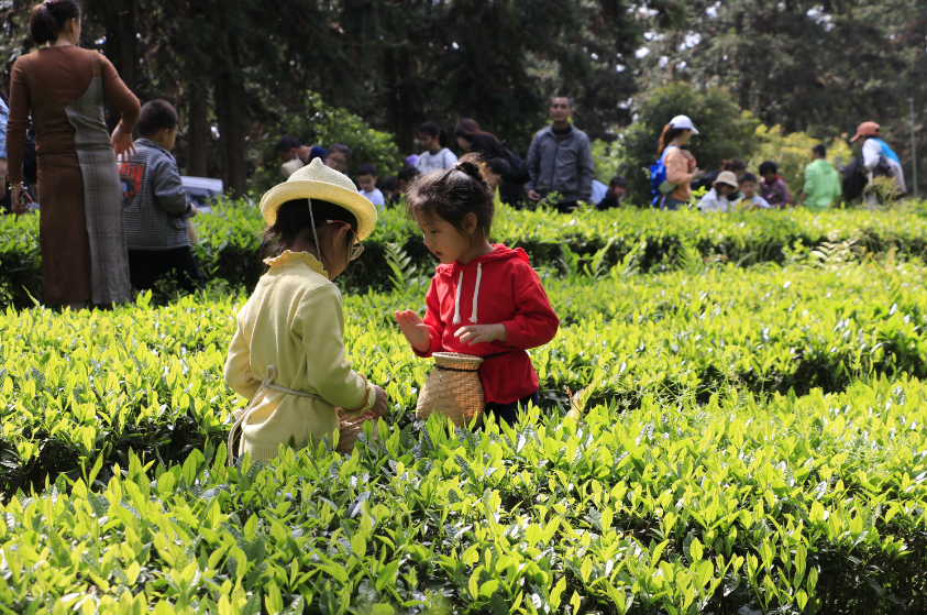 孩童在茶园体验采茶。陈小春/摄